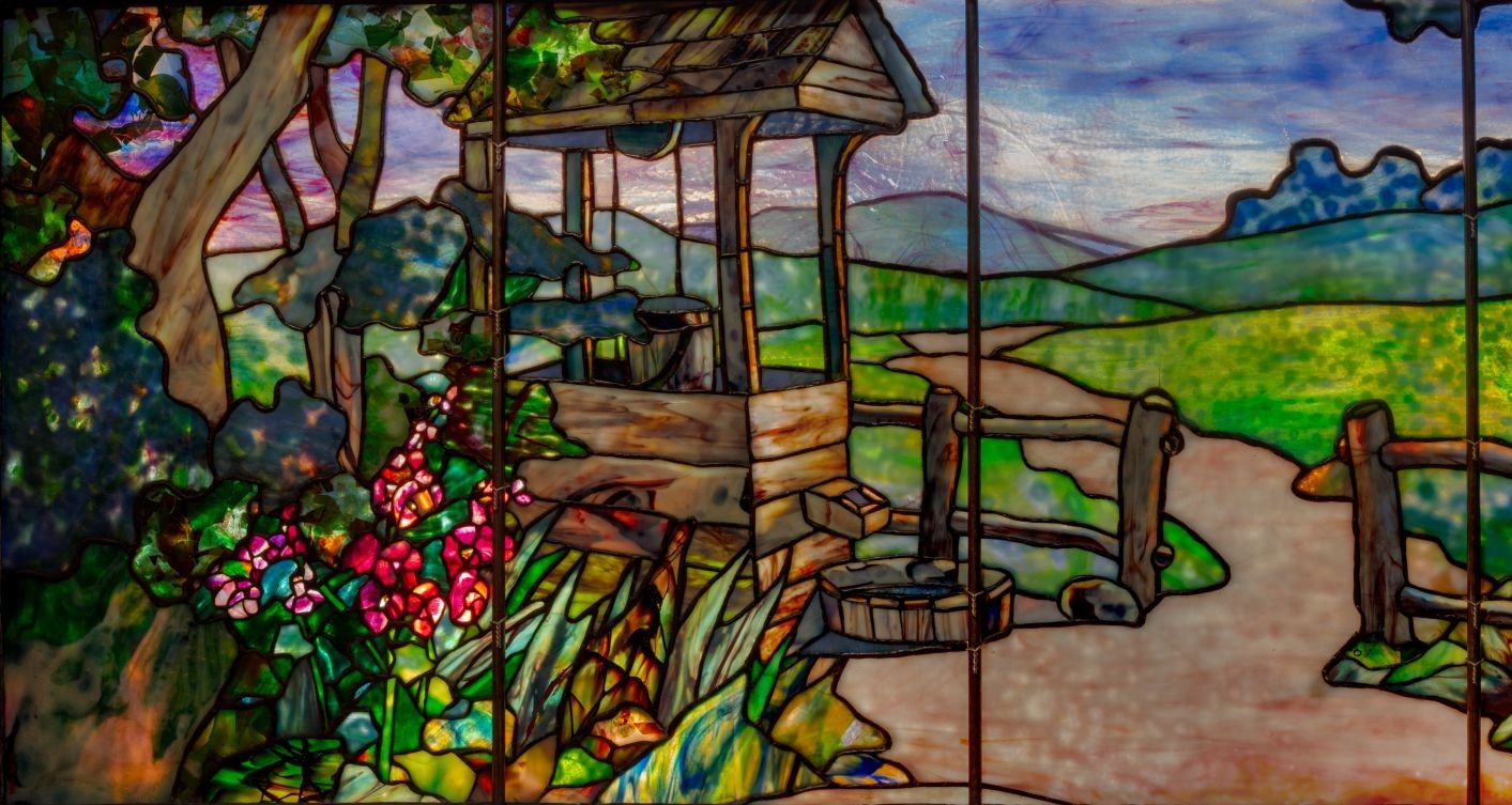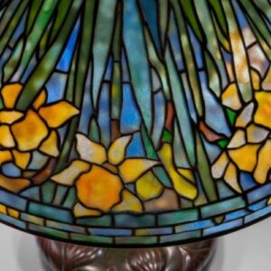 Louis C. Tiffany’s tireless exploration of glass as a creative medium and his enduring love of nature’s beauty prevailed in his visionary artistic approach. He staffed his Studios with designers, artists, and artisans who shared his passion for the rich colors and sinuous forms found in nature. Their skill, along with the vast range of colors and effects available to them, made it possible for Tiffany Studios to translate natural forms faithfully into glass: velvety or paper-thin petals, waxy or veined leaves, dappled sunlight or shadow, and much more. Perpetually in bloom, Tiffany’s floral lamps and landscape windows embody his Studios’ hallmark sophisticated design and exquisite craftsmanship.